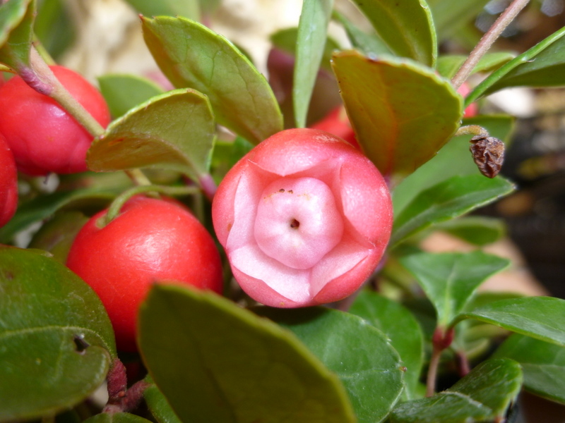 北アメリカの東部に分布しています。高さは15センチほどですが、細い茎が叢生して広がります。葉は楕円形から楕円状倒卵形で、光沢のある濃緑色です。夏、葉腋に白色から淡いピンク色の壺形の花を咲かせます。果実は球形で真っ赤に熟し、晩春まで残ります。食用にもなりますが、不味いという評価です。和名では「ヒメコウジ(姫柑子)」と呼ばれます。