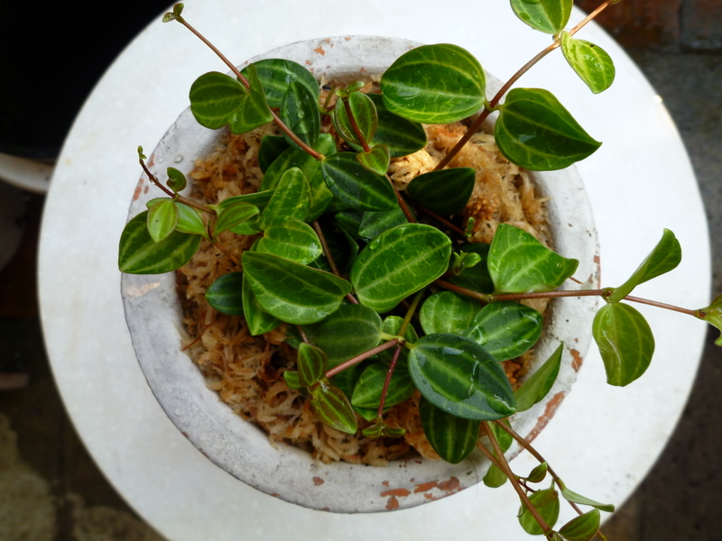 濃緑色の葉にしましま模様が個性的なペペロミア・アングラータ