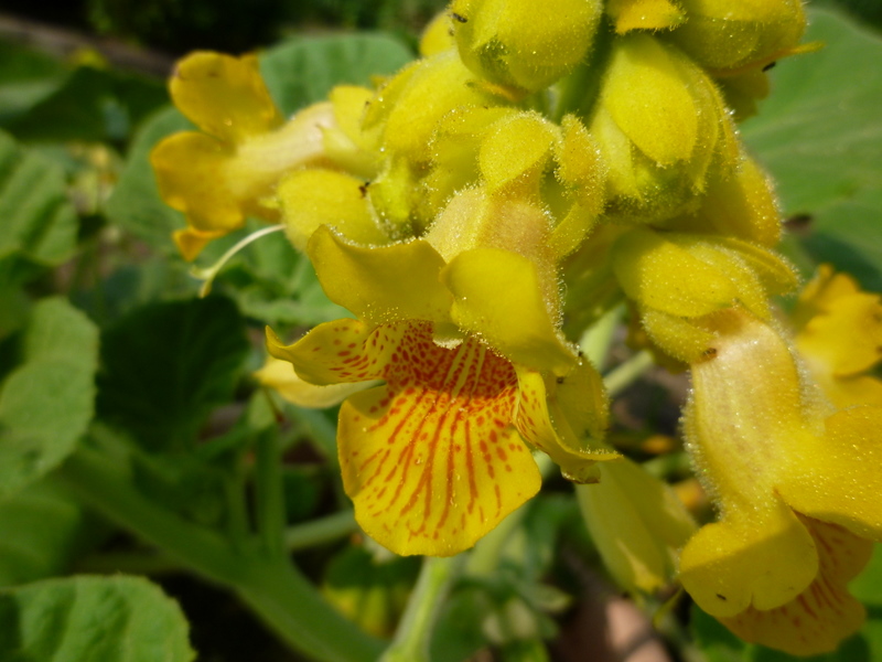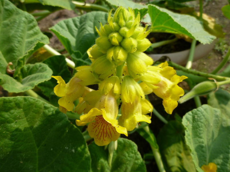 黄花角胡麻(キバナツノゴマ)は、夏に黄色い花を咲かせるツノゴマ科ツノゴマ属の一年性食虫植物です。葉は心型をしており、葉と茎はフキ(蕗)に似ています。葉や茎に生えている腺毛は粘々して、虫を捕らえます。花名は、花が淡桃色のツノゴマ(角胡麻)と似ており、花色が黄色いことから来ています。花の付き方は、総状花序(そうじょうかじょ)で、花柄(かへい)の先に5cm程の黄色い釣鐘形をした花を多数つけます。別名で、「悪魔の爪」と呼ばれますが、それは乾燥した果実の先が山羊の角または、錨のように反り返った爪状となっており接触した人や野生動物に刺さって危害を加えることから来ています。
