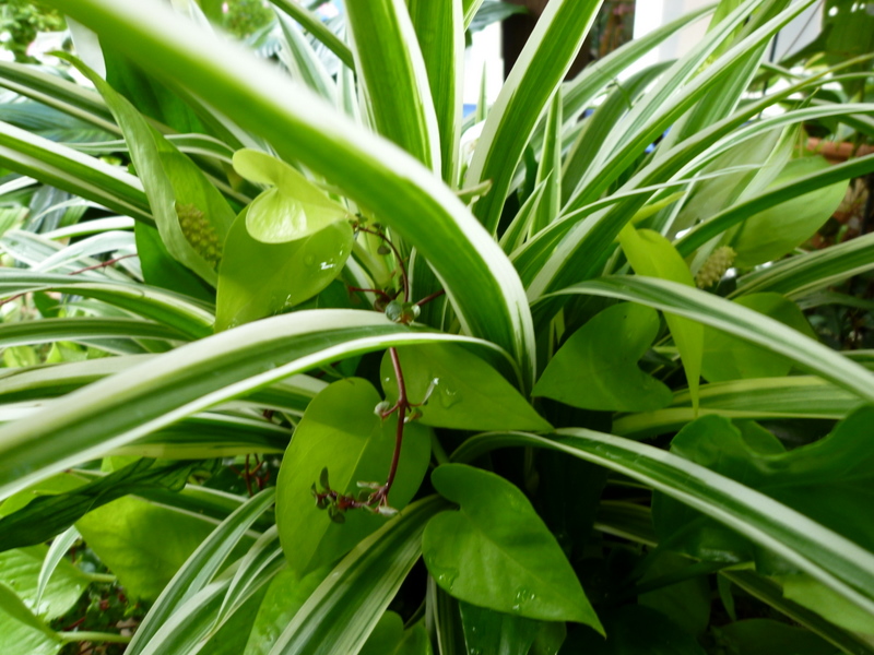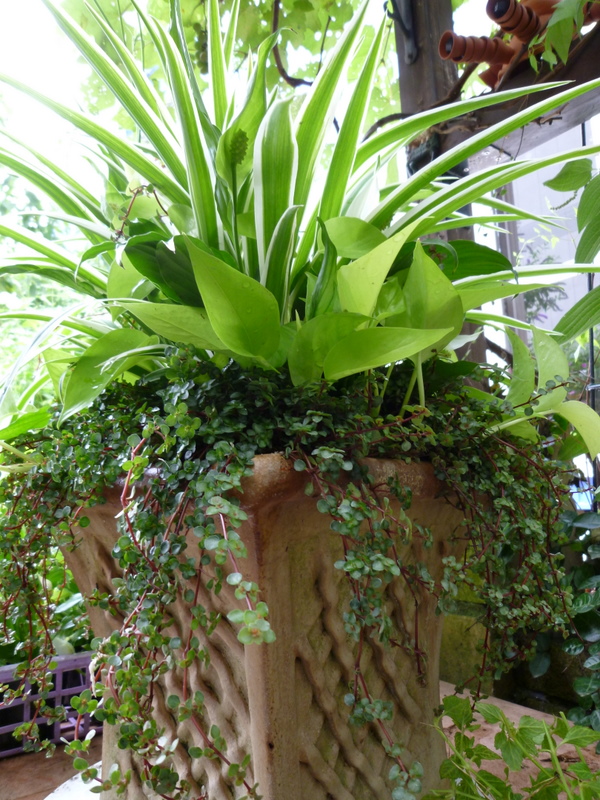 写真は 観葉のオリズルランを中心にスパティやライム色のポトスと で作りました。