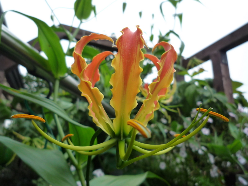 原産地はアフリカ、熱帯アジア。ユリ科グロリオサ続の植物。葉の先が巻きひげのように、絡み付いて体を安定させる。「栄光の」というラテン語から名前の由来が有る。背丈は1m~1m50cm、地上発芽は4月後半から。注意・・・この花 猛毒なそうです